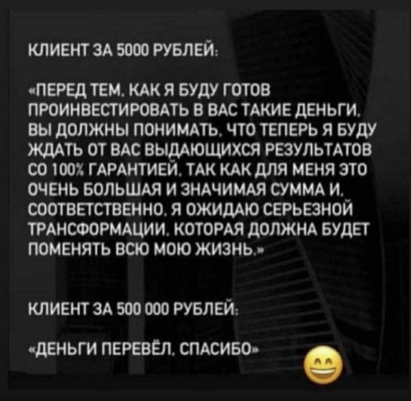 — Зачем мне что-то объяснять дурачкам, я лучше буду им отказывать и ждать пока прийдёт клиент, который сам по себе осознанный