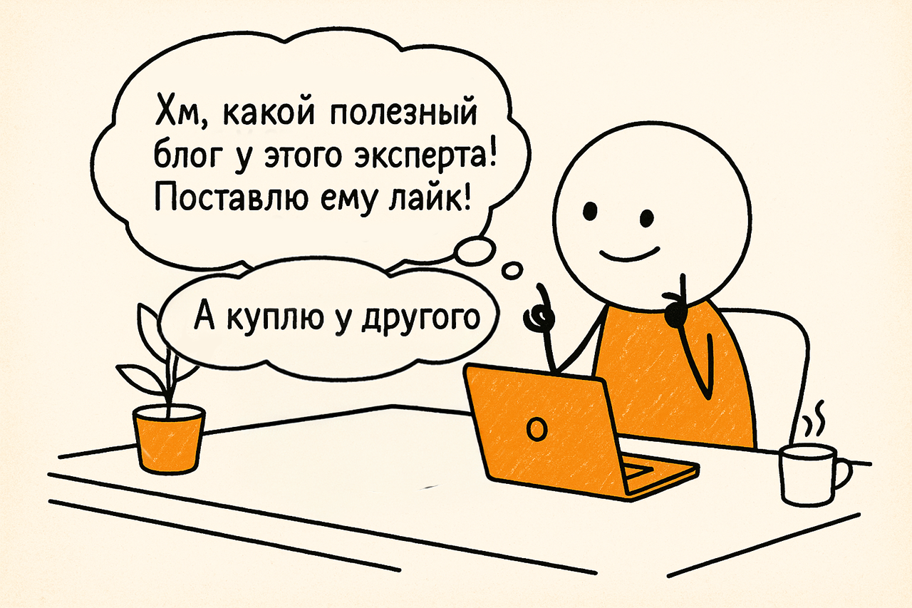 Эксперт очень хочет, чтобы люди покупали сами. Поэтому он старается писать как можно больше ценных и полезных постов. Он надеется, что люди оценят его профессионализм и купят. А они с удовольствием читают, лайкают, комментируют, благодарят, но… идут покупать у других.